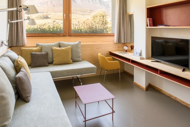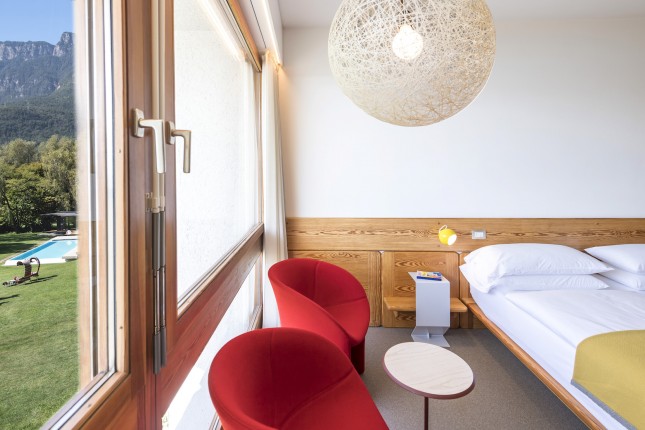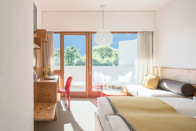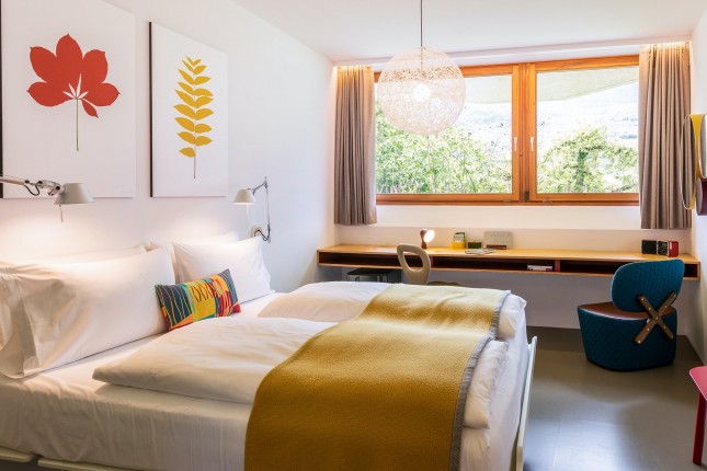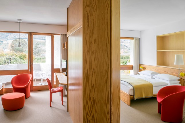 28 Zimmer und 4 Suiten im 1970er Stil, allesamt mit Blick auf das Seeufer. Sie sind Rückzugs- und Inspirationsräume, geprägt von den Elementen Wasser, Luft und Erde. Diese Elemente wurden in Farb- und Formgebung auch im Interieur von Othmar Barth aufgegriffen.
