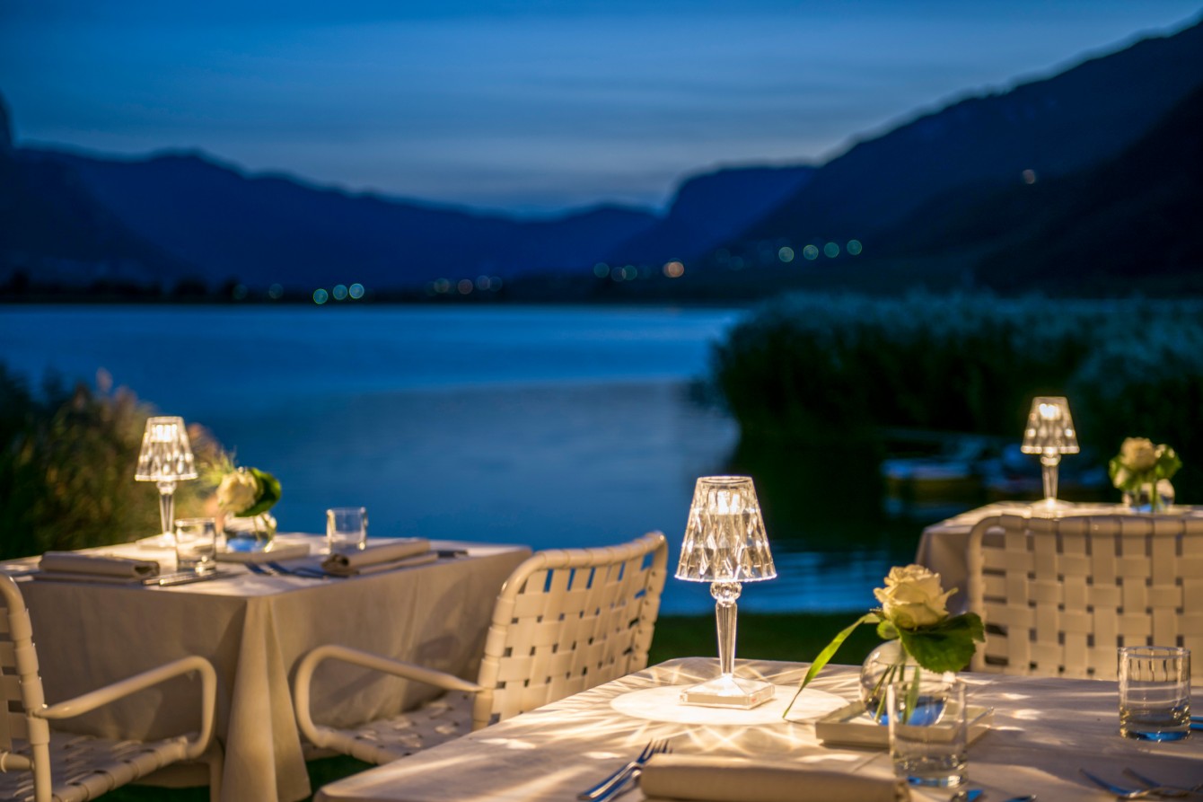 Winzige Details, gelegentlich nur Andeutungen vom Geschmack der 1970er Jahre bestimmen die Einrichtung: Das im Seehotel vielfach eingesetzte Oxidrot und Senfgelb, die Wand- und Tischleuchten, hier vom italienischen Leuchtenhersteller Artemide - sie überraschen durch kecke Eleganz, lenken den Blick aber nie ab vom Wesentlichen, dem Außenbereich.